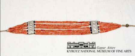 Состоит из 10 ниток кораллов, 2 прямоугольных металлических пластин,10 пластмассовых бусин, завершены металличекой бусиной и пуговицей.