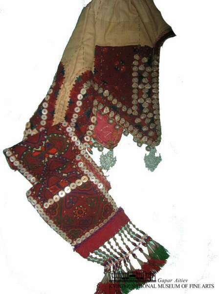 Праздничный головной убор национального костюма южных кыргызов,богато украшен ный вышивкой,перламутром,плетенными кистями,металлическими деталями.