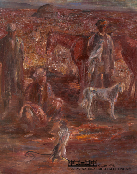 Вот что пишет об этой работе известный искусствовед Ольга Попова: «В картине «Охотники с беркутами» сумеречно-горячий, даже душный колорит при первом взгляде препятствует движению взгляда внутрь пространства, в котором нечетко вырисовываются контуры человеческих фигур. Однако преодолев сопротивление цветовой гаммы и живописной структуры, которые сами по себе обладают сильным эмоциональным воздействием, мы как бы входим в обширное пространство каменистой полупустыни, чтобы с неясным чувством тревожного удивления всмотреться в простые черты простых людей и почувствовать истинность их существования». И действительно, художник всегда работает с символами. Сюжет – три возраста. Старый охотник сидит, сложив руки на коленях. Его беркут перед ним на земле. Коллега помладше стоит за ним, он с краю картины и ничем не выделяется. Чуть поодаль стоит самый молодой, беркут у него на руках, рядом лошадь, впереди тайган. Он готов, но старшие товарищи не торопятся. Ранее утро и солнце формирует фантастическое тревожное освещение, наполняя сюжет новый смыслом. Что там впереди? Что готовит новый день? И новая охота? Вдали виднеется женщина с ребенком возле юрты – символ домашнего очага. Сюжет разворачивается пред зрителем, как на сцене. Это барельефный прием прямого обращения, характерный для сурового стиля. Но это не суровый стиль, это монументальный советский модернизм, хорошо встроенный в идеологию развитого брежневского социализма.