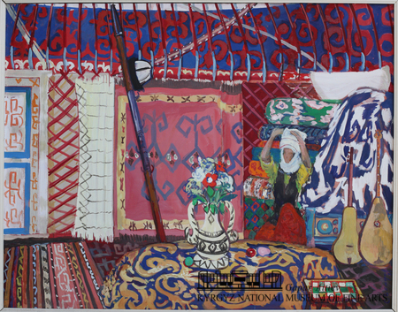Тема традиционная, а трактовка новая! Женщина в элечеке, по-видимому, прядет пряжу, делает характерные движения, и на ковре лежат шерстяные клубки. На подпорке юрты висит калпак. Комуз и домбра у края картины. Все остальное нарисовано плоскими узорами. Фантастическая феерия узоров и цветов. На стенах и на полу висят и лежат ковры и циновки. Слева порог, а справа на сундуке сложены стопкой одеяла. В центре юрты декоративный кувшин с цветами, танцующий подбоченившись. Танцуют все! Снизу и сверху неистово пляшут, водят хороводы прямыми линиями и диагоналями. Танцует женщина (и одновременно прядет), танцуют даже квадратные шашечки. Советского художника могли обвинить в назойливой эскизности. Мастер оправдывался: ему некогда делать долговременные тщательные работы, съемки фильмов мешают, надо быстро уловить настроение. И уловил: в его интерьерах и натюрмортах появился дух современности, свободомыслия и эксперимента. Новая возможность для развития дизайна, декоративного искусства! Художник не срисовывал узоры, а сочинял дикую фантазию, разрывающую рамки. Но эта возможность не станет продолжением.