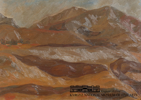 Композиция, напоминающая горы и холмы. Особенно верхняя часть. Видны небо и вершины. Но для осеннего пейзажа суховато и жестковато, больше похожа на груду метала. Охристый вечерний колорит становится медью, керамикой, кожей. В этом смысле картина больше напоминает упражнение на тему «Декоративный элемент». Сложная, глубокая композиция мастера. Такие фактурные детали есть в большой совместной работе, в «Монументе Дружбы народов». Это может быть объектом contemporary art! Брутальная фактура, на грани художественности, смелая, экспериментальная и этим интересная. Наконец, можно сказать, что это спорный декоративный рисунок, но никак не живопись.