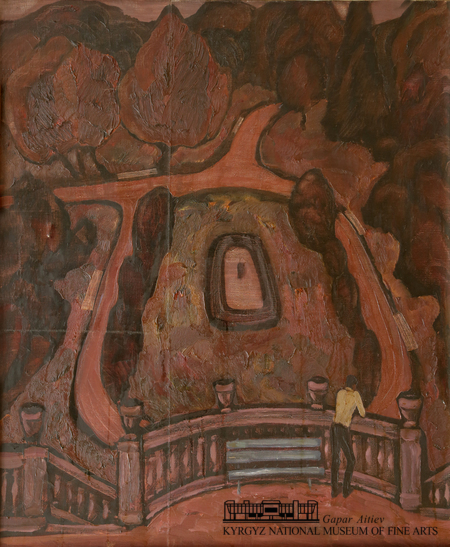 Пейзаж написан в литовском курортном городке Паланга, в Доме творчества Художественного фонда СССР, который вначале располагался в особняке графов Тышкевичей и чуть позже переехал в новое здание. Дворец Тышкевичей – памятник архитектуры – был построен в конце XIX века в неоренессансном стиле с элементами классицизма и барокко. С 1963 года во дворце находится музей янтаря. После провозглашения независимости Литвы особняк был возвращён наследнику – Альфреду Тышкевичу, который в свою очередь, передал его в дар Паланге и получил за это статус почетного гражданина города! Художник, стоя на террасе и обозревая партерное озеленение, видит в этой эклектике… модерн – по цвету, тону, линиям, широким овалам. Он рисует план с высоты птичьего полета, домысливая и уводя дорожки в глубину сада. Балясины, вазы, симметрия. Осенью, на терракотовом колорите выделяется зеленная скамейка и рядом Абдрай Осмонов (коллега автора) в белой водолазке и черных брюках. Он облокотился о перила и смотрит куда-то… не по центру. Прямоугольные скамейки разместились вдоль дорожек классического парка: советский дизайн вписался в дворянское гнездо. И сейчас было бы здорово – размещать общественные учреждения культуры и отдыха в старинных (и новых) особняках. Но не экспроприируя их, а выкупая или получая в подарок. Непонятно, откуда появились горизонтальные и вертикальные нитяные линии. Художник складывал холст для перевозки?