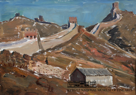 В переводе с китайского буквально «Длинная стена»: разделительная стена длиной почти 9000 км, построенная в древнем Китае. Крупнейший памятник архитектуры. Толщина Великой стены в основном около 5-8 метров, а высота чаще всего около 6-7 метров. Стена идёт вдоль горной цепи ИНЬШАНЬ, огибая все отроги, преодолевая как высокие подъёмы, так и весьма значительные ущелья. Желтая охра холмов и голубое небо соприкасаются и образуют главный силуэт композиции. Стены, изгибаясь на холмах, образуют дополнительную линию. Силуэт и линия, прихотливо изгибаясь и переплетаясь, передают сложное пространство. На переднем плане невзрачная постройка хозяйственного значения. Художник сразу угадал сюжет работы – дыхание истории, великая декорация и сегодняшний быт. Пейзажный этюд, сделанный во время командировки в Китайскую Народную Республику, в период нерушимой дружбы между двумя братскими странами – СССР и КНР. Этюды признанного мастера портрета не становились самостоятельными работами, они похожи на живописные путевые заметки.