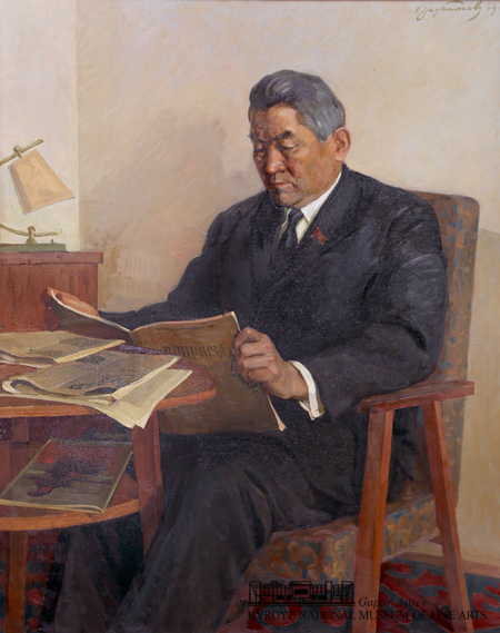 КУРМАН-ГАЛИ КАРАКЕЕВИЧ КАРАКЕЕВ (1913-2012) – советский киргизский историк, академик, президент Национальной академии наук Киргизской ССР (1960-1978), Член-корреспондент АН СССР (1968). Автор более 350-ти научных трудов, в том числе 10-ти монографий. Не только ученый, но и крупный партийный и хозяйственный деятель, много сделавший для создания и развития Национальной академии наук Кыргызской Республики. Член коммунистической партии большевиков с 1938 года. Портрет не парадный, на груди только депутатский значок. Академик с утра просматривает газеты, научные журналы. Незатейливое кресло, виден край журнального столика, часть комода с настольной лампой. Однотонные беленные стены. Разнообразия в типовую советскую среду с типовой советской мебелью добавляет ШЫРДАК, национальный ковер на полу. С краю, внизу, в тени, он убедительно свидетельствует о том, где это происходит.