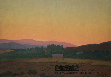 Такой же колорит, использован в другой великолепной картине «Закат». Но в названии этюда однозначно указано – это именно утро. Красно-оранжевое небо, не успевшее остыть за ночь. Вспаханное поле, край селения утопает в летней густой зелени. Темно-зеленые деревья, темно коричневые горы, земля еще хранит в себе прохладу ночи. В темноте просыпаются серо-голубые, серо-фиолетовые домики. Пока оттенки цветов на земле холоднее, но днем, когда все зальет солнечный свет, холодным станет голубое небо.
