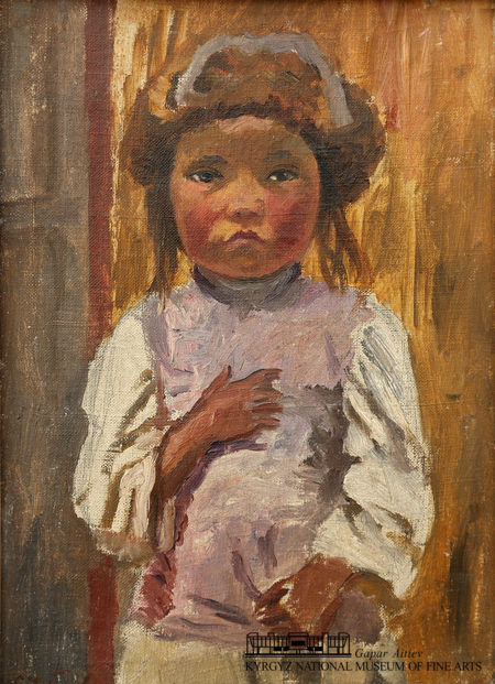 Дмитрий Владимирович Сарабьянов, известный советский и российский искусствовед, отмечает: «К середине 30-х годов в этюдах и эскизах из киргизской жизни художник все чаще ставит и новые задачи. Он пишет портретные этюды, которые свидетельствуют о попытках создать острую человеческую характеристику. … В 1935 году Чуйкову удается создать более пятидесяти этюдов в одном из аулов Иссык-Кульской области». Небольшой портретный этюд. Девочка в белой рубашке и безрукавке, в меховой шапке. Хорошо прописано только лицо – фигура и фон только намечены. Художник ищет позитивные, улыбчивые примеры, но всегда остается реалистом, ничего не приукрашивает. Девочка розовощекая, но у не маленькие ручонки и очень грустный взгляд. В середине 1930-х годов уже неуместно осуждать «трудную жизнь в царской России» – скорее всего, виноваты чересчур строгие родители.
