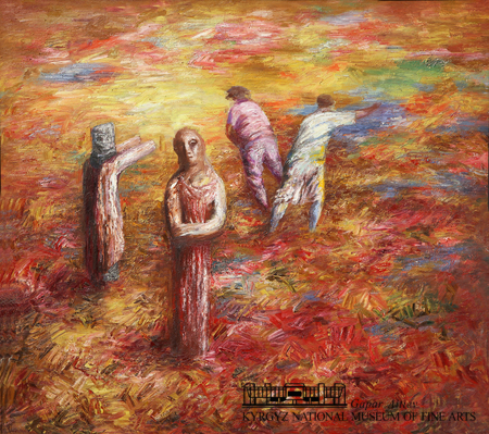 По центру композиции стоит во весь рост женщина и смотрит прямо на зрителя. Она скрестила руки на груди, во взгляде вопрос. Одета в античный хитон, на голове косынка. Ось центра смещена влево. Чуть дальше стоит женщина постарше, в чапане и элечеке, протягивает руки к уходящим фигурам молодых мужчин. Это о разрушении семьи? Как в гениальной повести «Джамиля»! Только несколько карикатурно нарисовано. О разрушении традиций и нежелании детей жить по патриархальным лекалам? Как в гениальном фильме «Пастбище Бакая»! Но живописная картина не только об этом – она о разобщенности современного общества вообще! И не об этом тоже! Она о чем-то большем, неуловимом…. Женщина в традиционной одежде вопрошает к упитанным городским недорослям. А женщина в центре – это универсальный символ. Это равновесие, к которому надо стремится…, правда, не всегда получается…. В канун «перестройки» Республика оказалась в ситуации неопределенности. Жить как раньше не хотела, а по-новому не могла. И, когда окунаешься в атмосферу тех лет, понимаешь, что эта картина – адекватное отражение той реальности. Более того, ситуация неопределенности продолжается до сих пор. Долгое время символом нашей Независимости была женщина в античных нарядах. Добавилась проблема трудовой миграции. Теперь понятно, куда на самом деле бегут мужчины…. Живописные образы, созданные в середине 80-х годов прошлого века, актуальны до сих пор. Это символы, нашедшие свою форму и живущие своей собственной жизнью. Правда, от частого употребления, живые символы превращаются в карикатурные штампы.