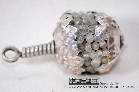 In the form of an acorn with a long twisted leg. Body made of glass beads.