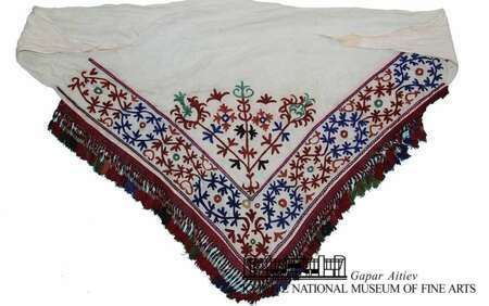 Үч бурчтуу формадагы түштүк кыргыз кийиминин бурчун кооздогон саймалуу жана токулган кийиздердин салттуу жоолугу.